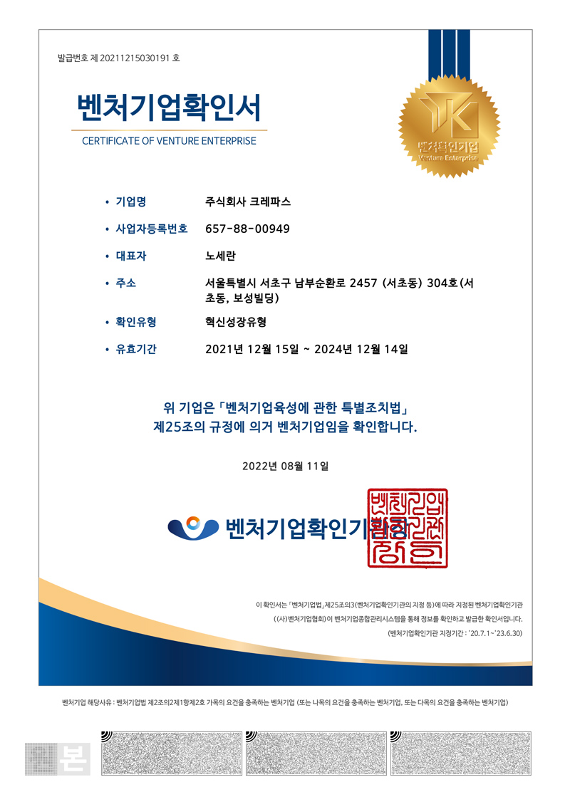 벤처기업확인 인증(혁신성장형) 페이지 정보 작성자 최고관리자 작성일21-12-15 17:24 조회16,395회 댓글0건 관련링크 본문 (주)크레파스는 2021년 12월 15일자로 벤처기업확인 인증을 받았습니다. 제 20211215030191호 댓글목록 등록된 댓글이 없습니다. 이전글 다음글 목록