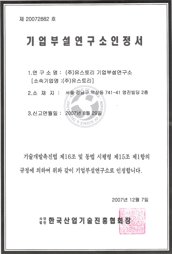 한국산업기술진흥협회로부터 기업부설연구소 설립 인가를 취득하였다.