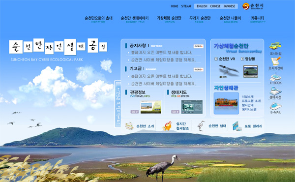 이번 순천만 자연생태공원에는 WEB GIS system, 실시간 카메라, OVR,PVR등 첨단 인터넷 기술을 도입하여 보다 다양한 컨텐츠를 제공하고 있다.